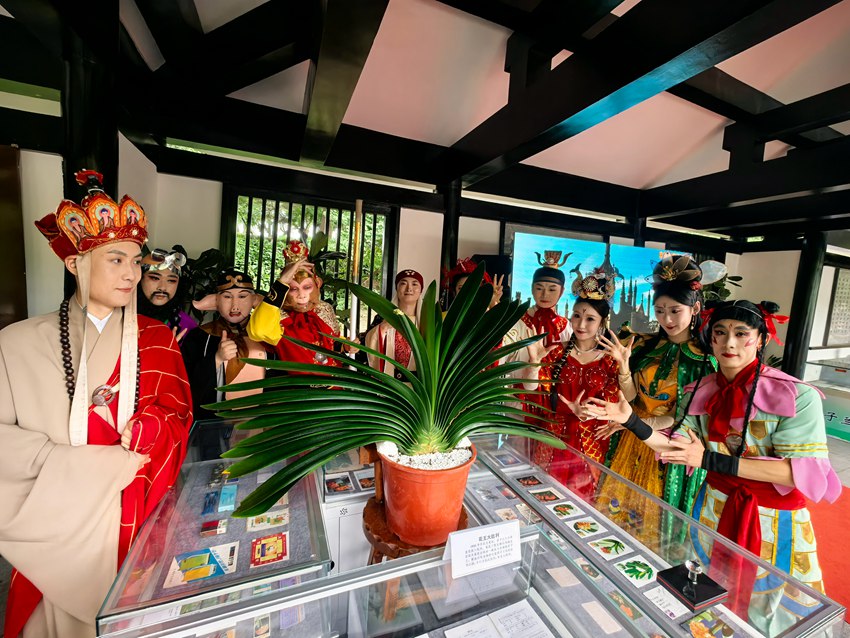 “蘭亭集序”靜思廊內,兩株葉展1.5米、葉面寬10-12厘米,花齡四十載的君子蘭花王“大勝利”與古琴、書畫共演雅集,高清紀錄片展示君子蘭培育智慧。許多游客在花前合影,或靜心觀賞,或輕聲交流,在繁忙都市中尋得一份寧靜與詩意。君子蘭愛好者與現場技術人員探討著君子蘭品種特性與栽培技巧,“這‘大勝利’葉片厚實,脈絡清晰,是難得的佳品。”年長的老先生贊嘆道,言語間盡顯對君子蘭的深厚情感。