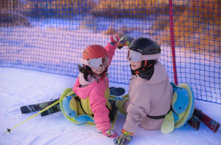 在北大湖滑雪度假區,孩子們在教練指導下練習轉彎、剎車,摔倒后重新站起的勇氣比分數更珍貴﹔