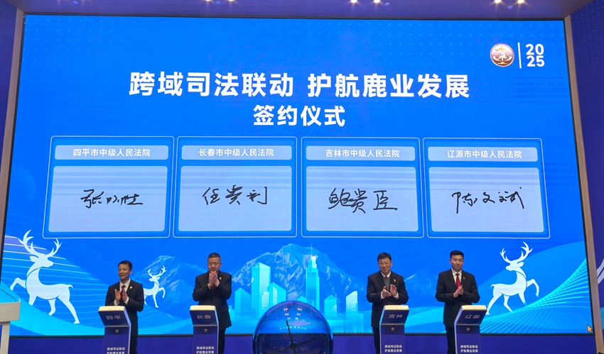 在吉林省高級人民法院的統籌部署下,長春市中級人民法院、吉林市中級人民法院、四平市中級人民法院、遼源市中級人民法院四家法院聯合簽署《關於構建吉林省梅花鹿產業跨區域司法保護協作框架協議》。長春市委常委、政法委書記周賀出席啟動(簽約)儀式。