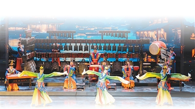 台上,古編鐘、編磬、鼓、箎、笙、琴、瑟、排簫等多種傳統樂器,與現代樂器、燈光舞美結合,配合長袖翩翩的舞蹈,仿佛瞬間將觀眾帶入一個貫通古今的聲場。