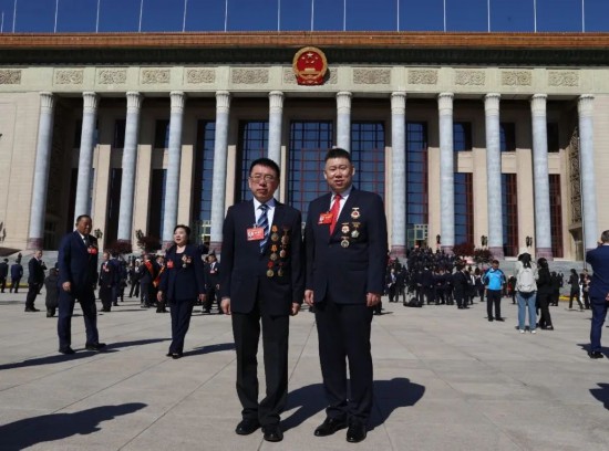 人民大会堂前,师徒二人佩戴奖章并肩而立:李万君的奖章泛着岁月痕迹,何岩的奖章闪耀时代光芒,共同见证中国高铁事业从 “跟跑”到“领跑”的跨越。