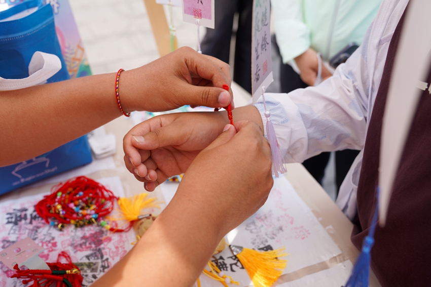 景区入口游客可免费品尝六鼎山禅茶,感受独特韵味,还能领取象征全年招财进宝的金玉满堂福蛋。现场设有打卡墙,吸引众多游客拍照留念。同时,端午答题送香囊、互动送五彩绳活动也人气火爆,大量游客关注六鼎山官方抖音号并参与评论答题,积极完成互动发布抖音视频,领取好运五彩绳和生财布兜子。朝鲜族、满族、藏族、蒙古族等民族特色舞蹈依次呈现,比武招亲、满族婚礼秀等满风满俗浓厚,搭配唢呐、非洲鼓等乐器演奏,为观众带来视听盛宴。