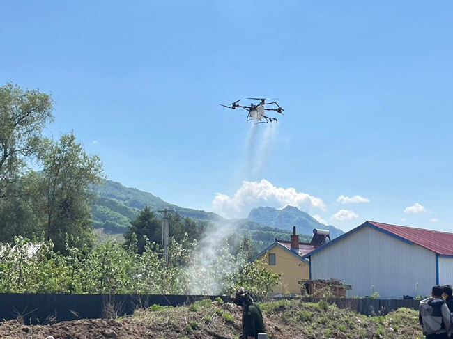 “我家有块地没有机耕路。今年夏天旱,果树需要浇水。我先让人走去地里,然后用无人机运水,一次可以运75公斤,省时省力。” 韩飞开心地说。