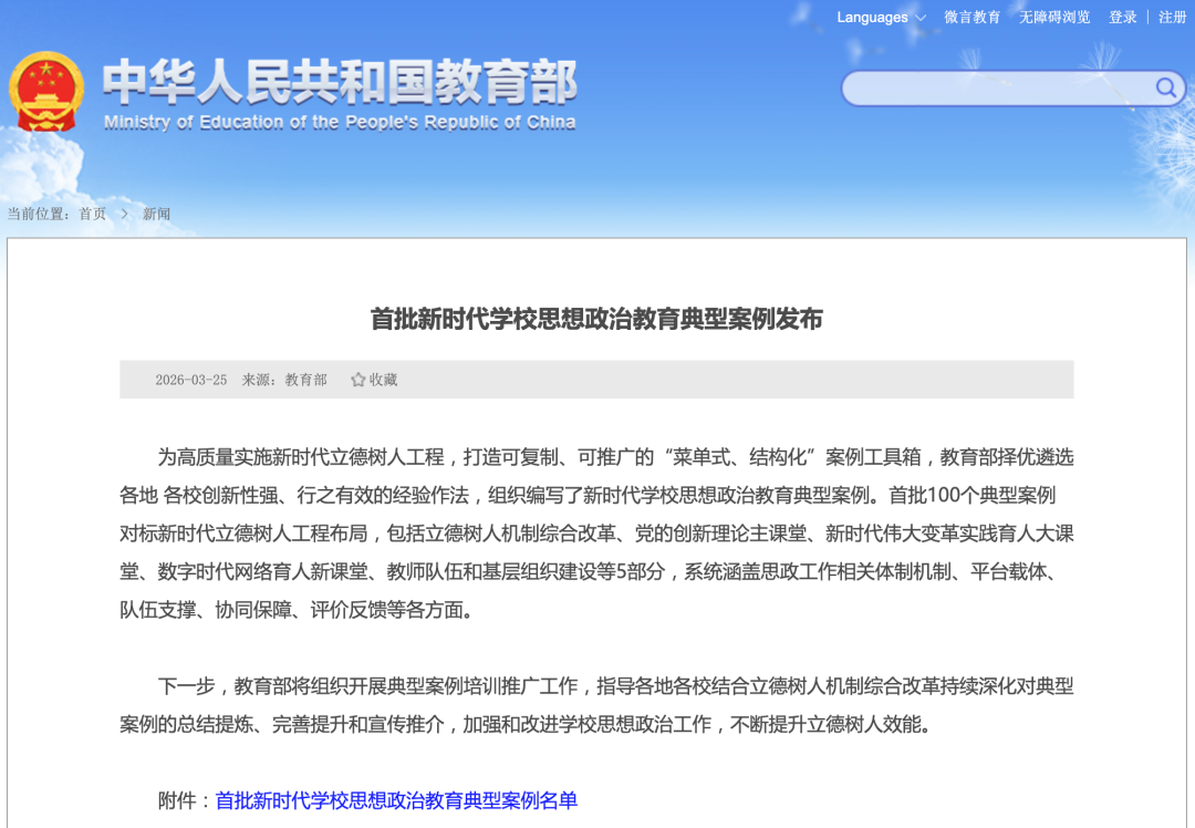 为扎实推进立德树人机制综合改革,加强和改进学校思想政治工作,不断提升立德树人效能,教育部择优遴选各地各校创新性强、行之有效的经验作法,组织编写了新时代学校思想政治教育典型案例。首批100个典型案例对标新时代立德树人工程布局,包括立德树人机制综合改革、党的创新理论主课堂、新时代伟大变革实践育人大课堂、数字时代网络育人新课堂、教师队伍和基层组织建设等5部分,系统涵盖思政工作相关体制机制、平台载体、队伍支撑、协同保障、评价反馈等各方面。