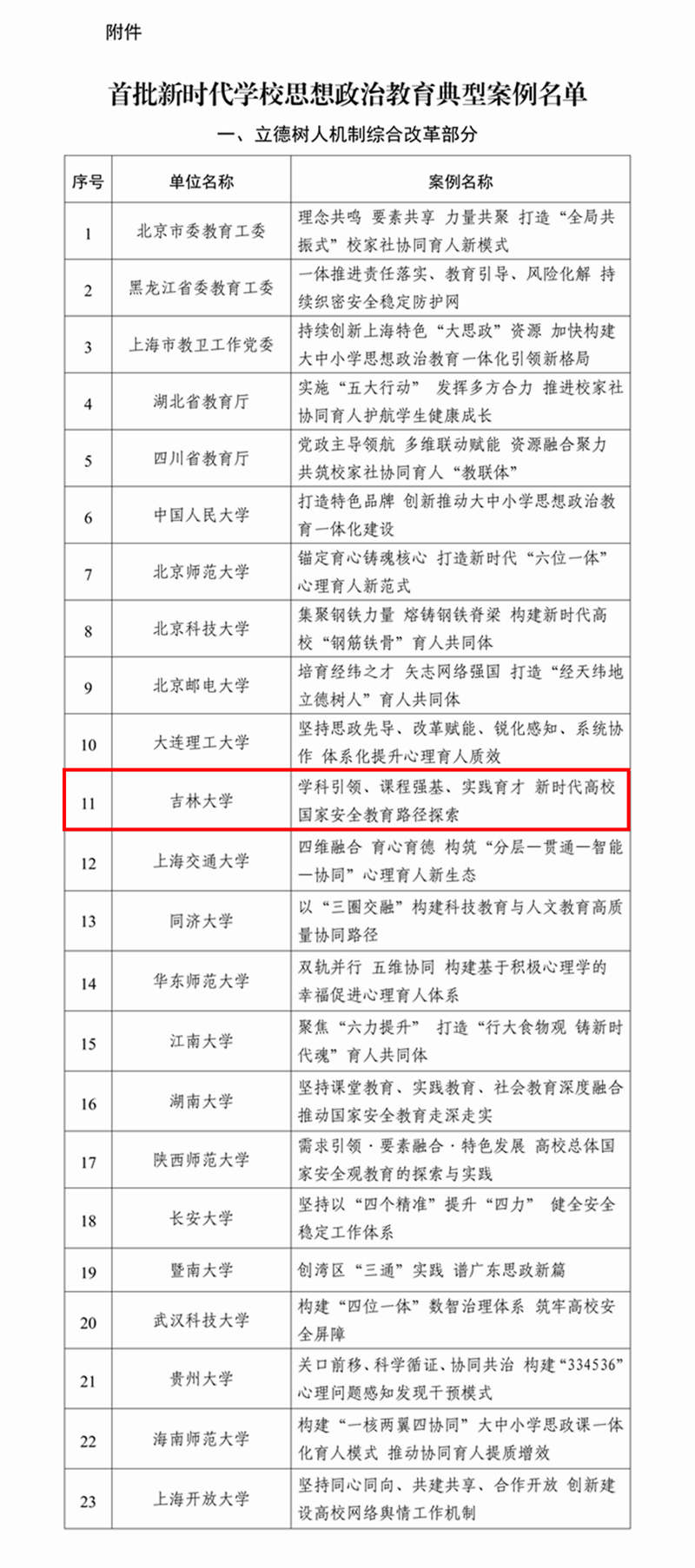 收藏3月25日,教育部网站公布首批新时代学校思想政治教育典型案例。由吉林大学党委宣传部、党委学生工作部牵头,公共外交学院申报的《学科引领、课程强基、实践育才 新时代高校国家安全教育路径探索》案例成功入选典型案例“立德树人机制综合改革”部分。